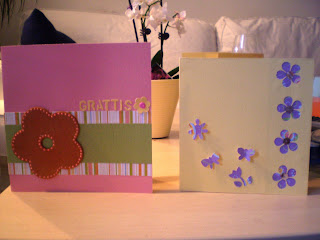 Här kommer två kort till. Det rosa är scrapliftat och det gula har jag bara gjort, testat grejer med min cuttlebug och stans.