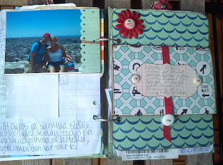 Fram- och baksida av boken har jag gjort av chipboard/kartong som jag har klätt med papper från October Afternoon Seaside. Jag har stämplat med Walnut Ink "Explore" och "Adventure" som är stämplar från Recollections och Stampendous. Satt fast stickers från samma kollektion (October afternoon- Seaside) samt Thickers från American Craft. Jag har lackat allt för att få ett hållbart resultat, boken skulle ju med överallt.
