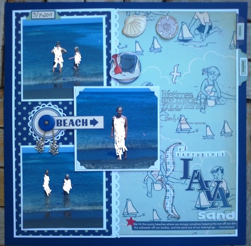 Jag vet att jag har varit dålig på att uppdatera bloggen men det har varit sjukt mycket på jobbet och jag har inte orkat scrappa eller uppdatera bloggen. I lördags gjorde jag en LO som var inspirerad av en skiss på Svensk Scrapbooking. Jag hittade tre bilder från i somras på Santorini. Vi försökte komma bort från Thiras kommers genom att uppsöka en strand i de timmar som vi var på Santorini. Vi hittade en strand som heter Monolitos. Svart lavasand och väldigt långgrunt. Det som störde lugnet var att stranden ligger vid flygplatsen så det startade och landade plan stup i ett. Barnen brydde sig inte, de var bara glada att få bada, jag brydde mig inte för jag var glad att slippa inkastare och en massa människor.