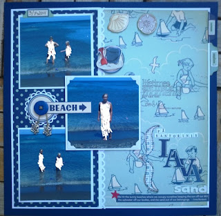 På höger sida av layouten finns en gömd textruta, där jag har skrivit om våra upplevelser. Dekorationerna har jag satt glossy accents på och crackle paint för att göra dem något roligare. Fick stoppa in lite röda detaljer för annars blev layouten väldigt blå, på den ocensurerade LO:n har min äldsta dotter en röd bikini.