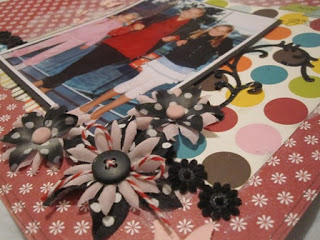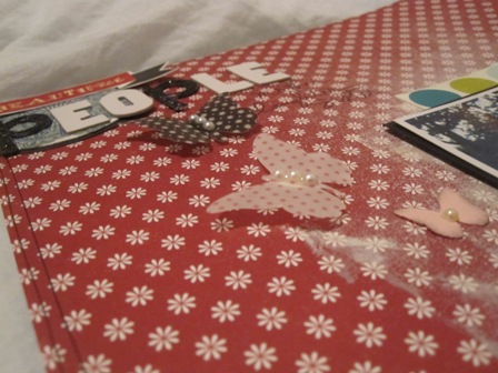 Använt en massa vitt mistspray från Calico (tror jag) och vit akrylfärg från Making Memories. Bakom det prickiga pappret finns en journaling tag med information vad som hände den dagen fotot är taget.