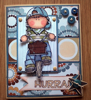 Har paperpiecat stämpelmotivets keps, halsduk och cykelkorg.