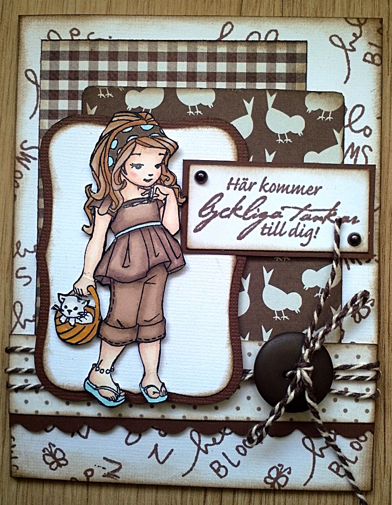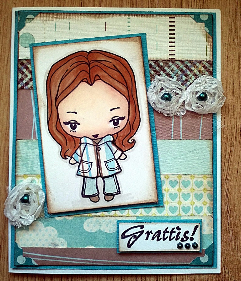 Stämpelmotivet har jag paperpiecat med papper från Maja Design samt färglagt hud med och hår med Promarkers.
