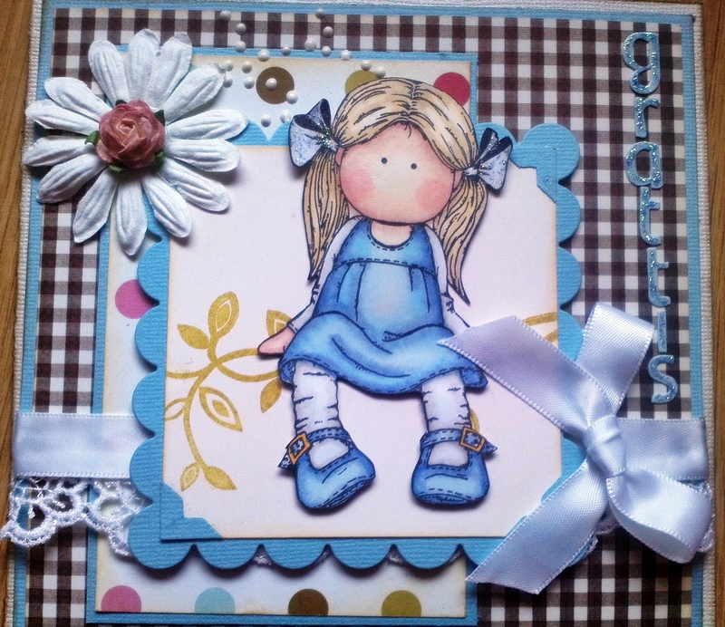 hÄngel färglagd med Promarkers, hon sitter på "en kvist" som är en stämpel från Basic Grey.