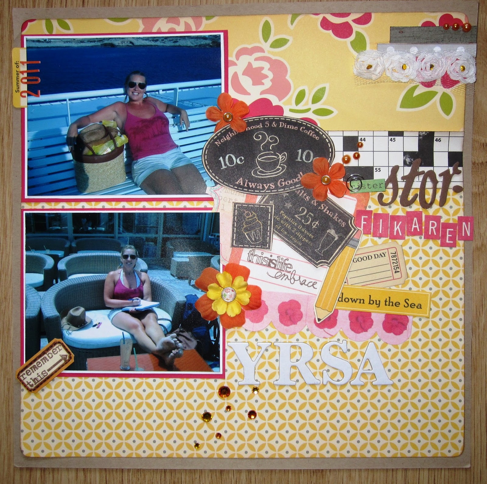 För två helger sedan gjorde jag en dubbelLayOut till mitt numera väldigt tjocka greklandsalbum. Jag måste köpa ett stort album till alla min LayOuter från båtluffen 2011. Den LO:n som jag tänkte visa idag visar en typisk stranddag i Grekland för min äldsta dotter. Hon kan gå i vattengrynet i timtals för att fånga fisk, eremitkräftor eller andra vattenlevande djur. Runt Amorgos är det ett rikt vattenliv tillika väldigt klart vatten, där har det blivit många fina fångster under åren. Ett år hittade vi en lång tjock rödaktig larv (mask) ett annat år en sjöstjärna. Förra året blev det mest småfisk och eremitkräfor.