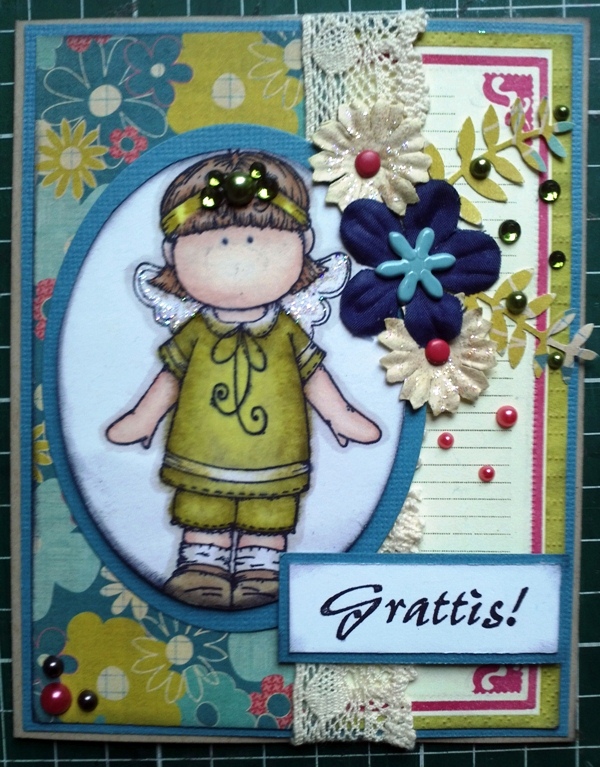 Det andra kortet är väldigt enkelt. Det är bara ett klistermärke från Sassafrass Lass, några brads och en textstämpel samt mönstrat papper från Daisy Backet (tror jag)