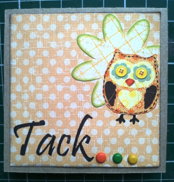 Det andra kortet är väldigt enkelt. Det är bara ett klistermärke från Sassafrass Lass, några brads och en textstämpel samt mönstrat papper från Daisy Backet (tror jag)