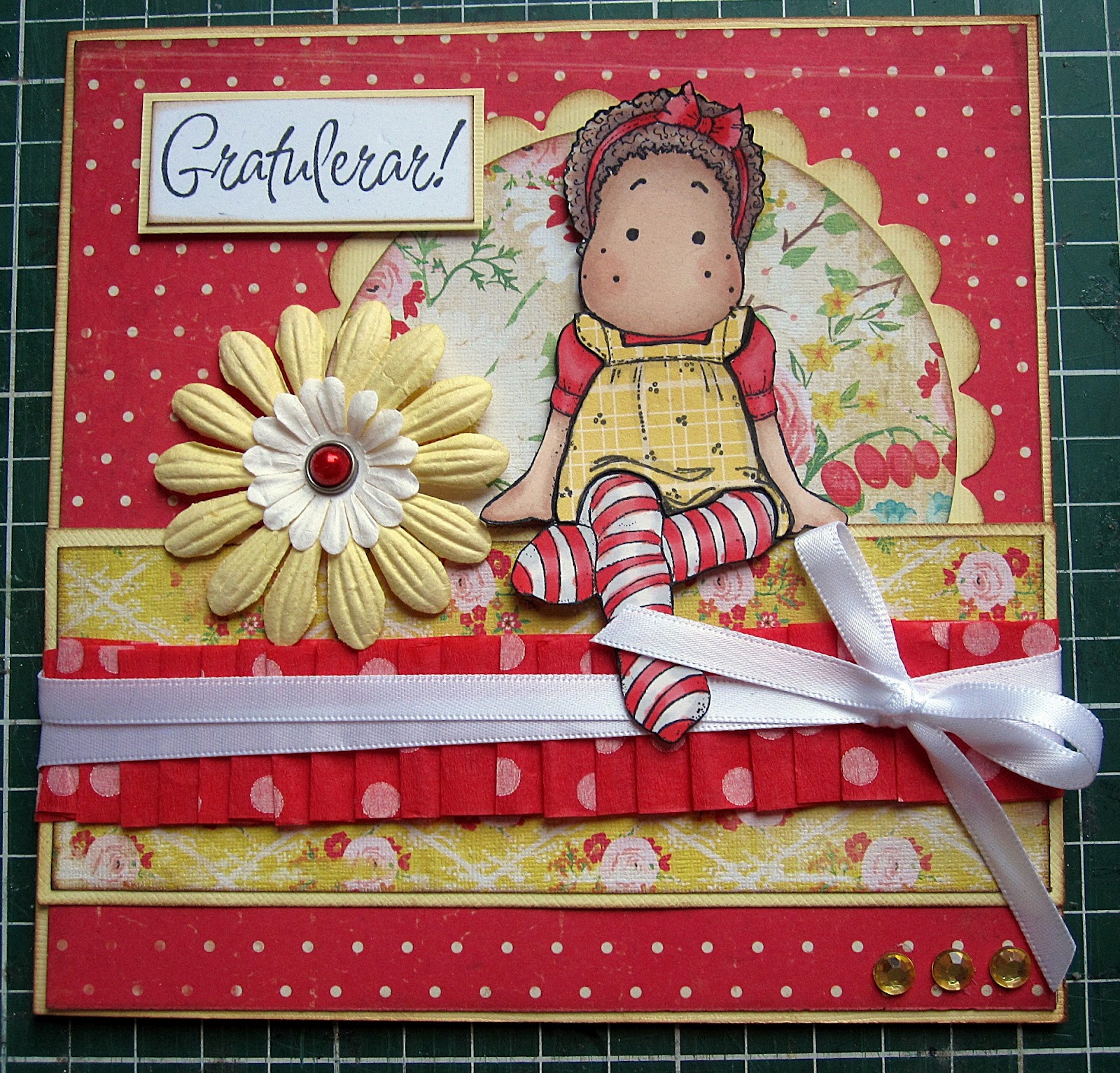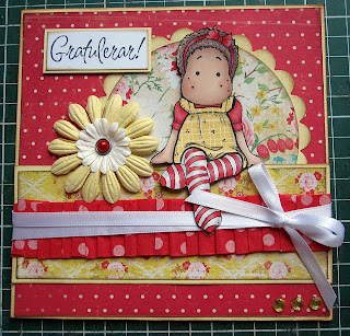 Flickan är en magnoliastämpel och jag har färglagt henne med Promarkerpennor och paperpiecat henne dvs stämplat på mönstrat papper, klippt ut och klistrat in.